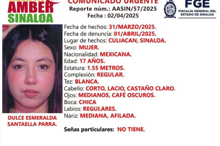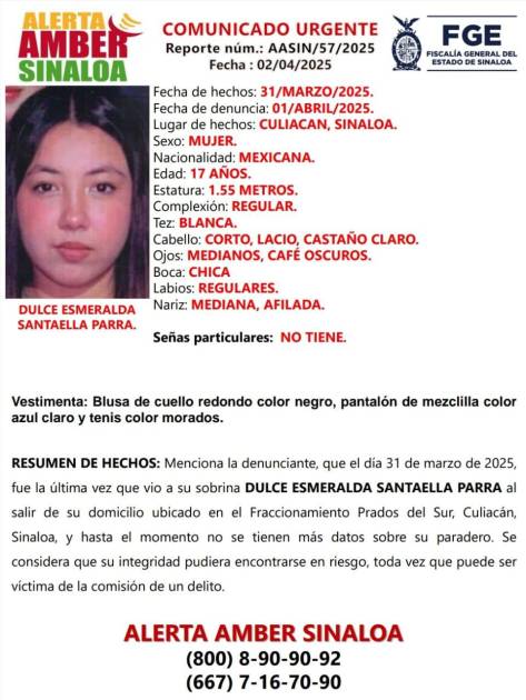 La Fiscalía General de Sinaloa (FGE) emitió la Alerta Amber para la localización de Dulce Esmeralda “N”, de 17 años de edad, desaparecida desde el 31 de marzo en Culiacán.