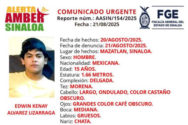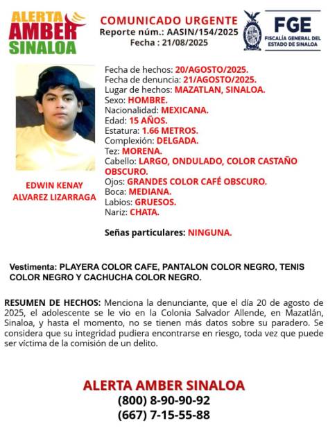 CULIACÁN. _ La Fiscalía General del Estado de Sinaloa emitió una Alerta Amber para la localización de Edwin Kenay “N”, de 15 años de edad que fue reportado como desaparecido en Mazatlán.