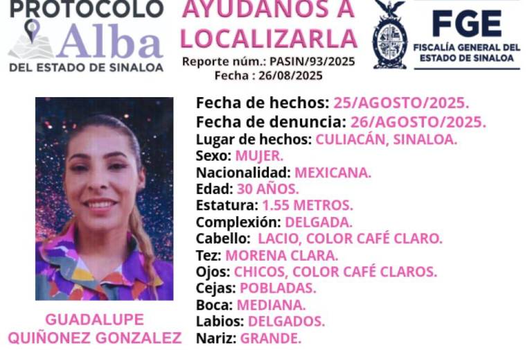 CULIACÁN._ La Fiscalía General del Estado activó Protocolo Alba para pedir apoyo en la localización de Guadalupe Quiñónez González, desaparecida en Jardines de Santa Fe, en Culiacán.