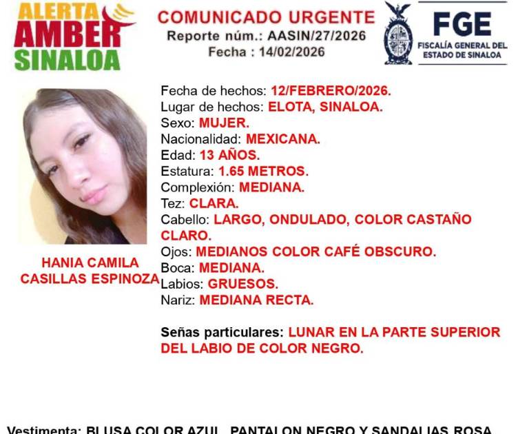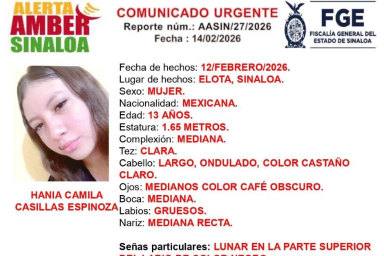 ELOTA. _ La Fiscalía General del Estado (FGE) activó una Alerta Amber tras la desaparición de Hania Camila Casillas Espinoza, de 13 años de edad, quien fue vista por última vez hace cuatro días en el municipio de Elota.