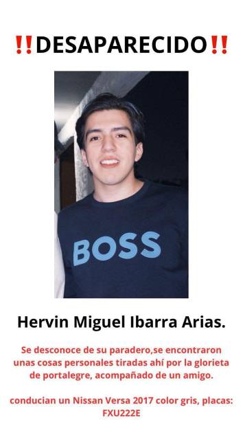 Al momento de su desaparición, Hervin Miguel y su amigo se trasladaban en un vehículo Nissan Versa, modelo 2017, color gris, con placas FXU-222E.