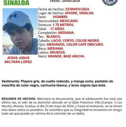 La última vez que se le vio a Jesús José Beltrán López, adolescente de 17 años, fue el 23 de mayo de 2024, al salir de su domicilio en el Ejido Francisco Villa, campo uno, Los Mochis, Ahome, y hasta el momento no se tienen más datos sobre su paradero.