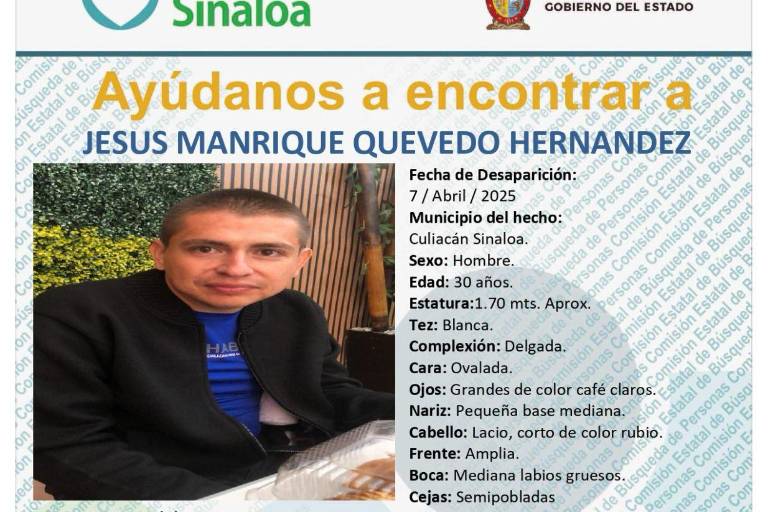 CULIACÁN. _ La Comisión Estatal de Búsqueda emitió una alerta para encontrar a Jesús Manrique Quevedo Hernández, un hombre de 30 años reportado como desaparecido el 7 de abril el Culiacán.