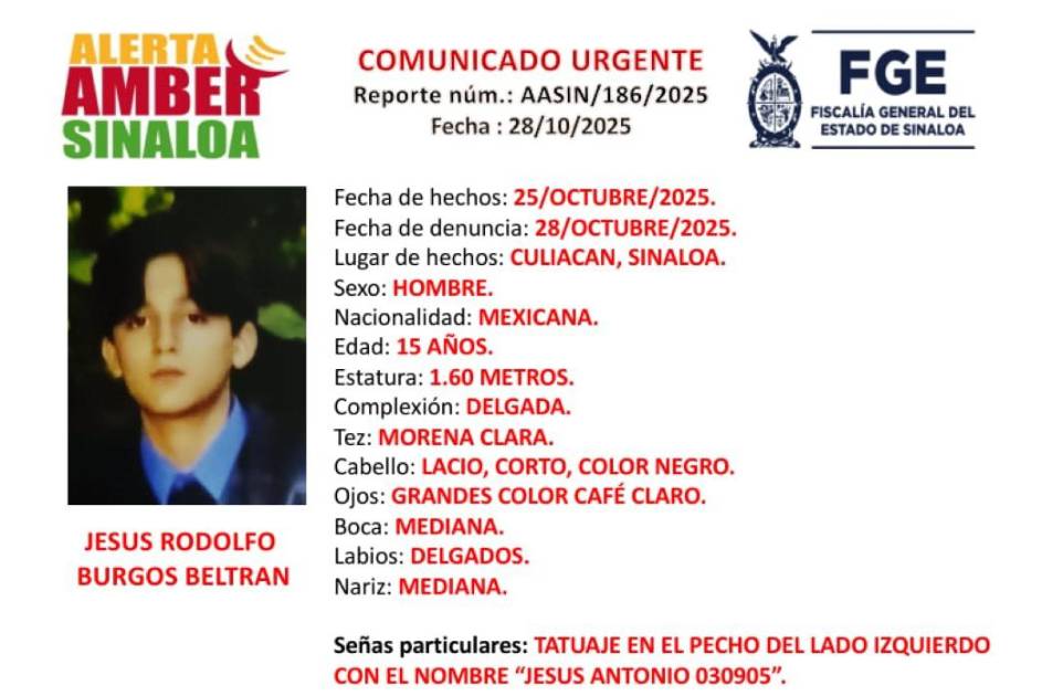 CULIACÁN._ La Fiscalía General del Estado de Sinaloa activó el protocolo de Alerta Amber para la localización de Jesús Rodolfo Burgos Beltrán, un adolescente de 15 años reportado como desaparecido desde el pasado miércoles 25 de octubre de 2025 en esta capital.