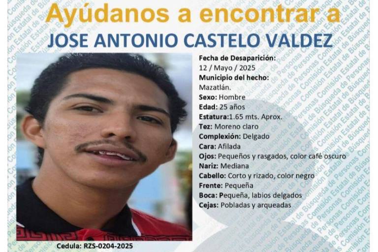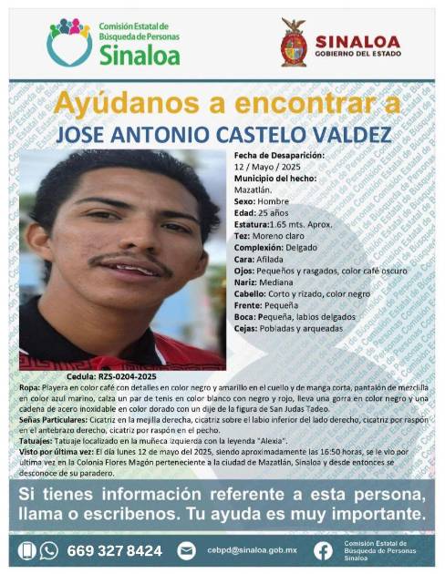 MAZATLÁN. _ La Comisión Estatal de Búsqueda de Personas de Sinaloa mantiene activa la ficha de búsqueda de José Antonio Castelo Valdez, de 25 años de edad, quien fue reportado como desaparecido el pasado 12 de mayo de 2025 en este puerto.