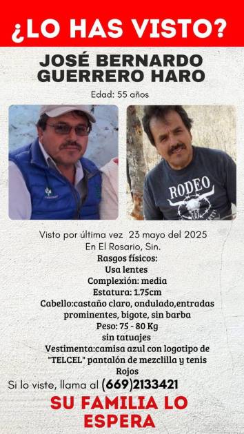 ROSARIO. _ La familia de José Bernardo Guerrero Haro, de 55 años, ha solicitado el apoyo de la ciudadanía para localizarlo, luego de que fuera visto por última vez el pasado 23 de mayo en el municipio de El Rosario, Sinaloa.
