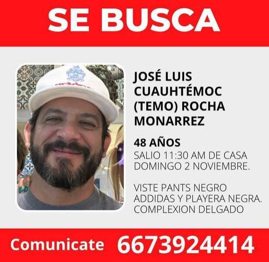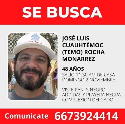 CULIACÁN. _ José Luis Cuauhtémoc Rocha Monárrez, de 48 años, fue reportado como desaparecido en Culiacán luego de salir de su domicilio la mañana del domingo 2 de noviembre. Desde entonces, no se tiene información sobre su paradero.