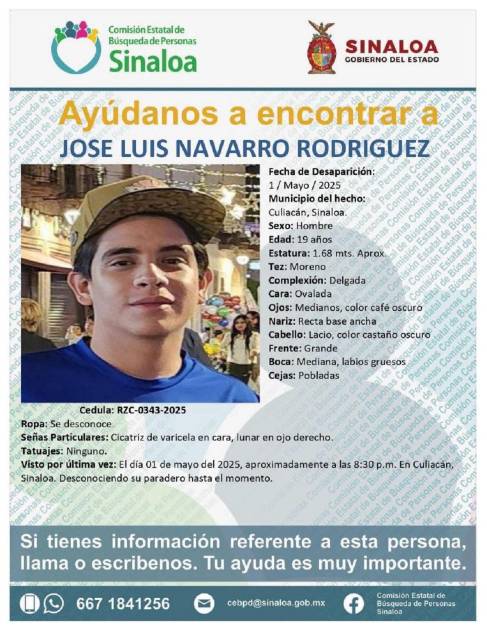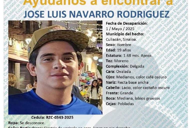 CULIACÁN.- José Luis Navarro Rodríguez, un joven de 19 años, se encuentra desaparecido desde la noche del jueves 1 de mayo en Culiacán, Sinaloa. De acuerdo con la ficha emitida por la Comisión Estatal de Búsqueda de Personas, fue visto por última vez alrededor de las 20:30 horas; al momento de su desaparición, no se tienen datos confirmados sobre la vestimenta que portaba.