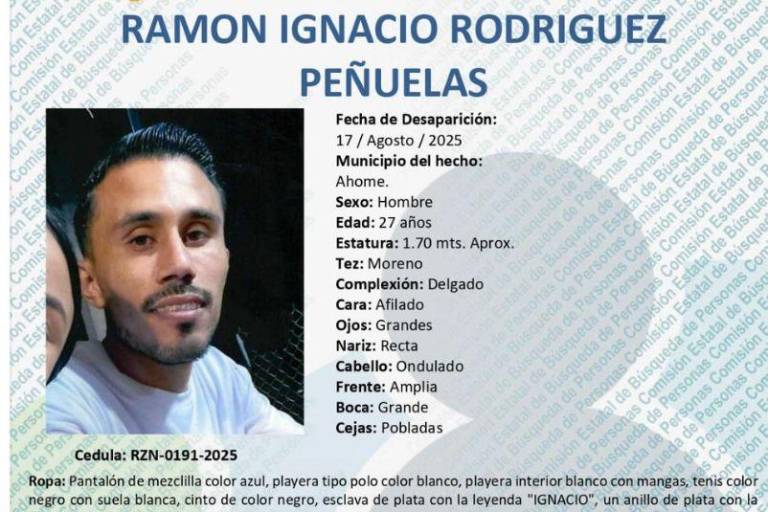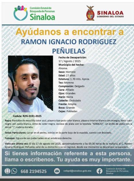 AHOME. _ La Comisión Estatal de Búsqueda de Personas de Sinaloa emitió una ficha de búsqueda para localizar a Ramón Ignacio Rodríguez Peñuelas, de 27 años de edad, quien se encuentra desaparecido desde el pasado 17 de agosto de 2025 en el municipio de Ahome.