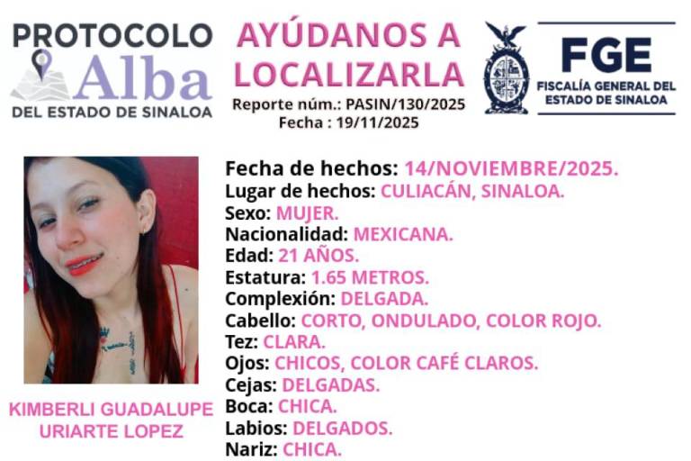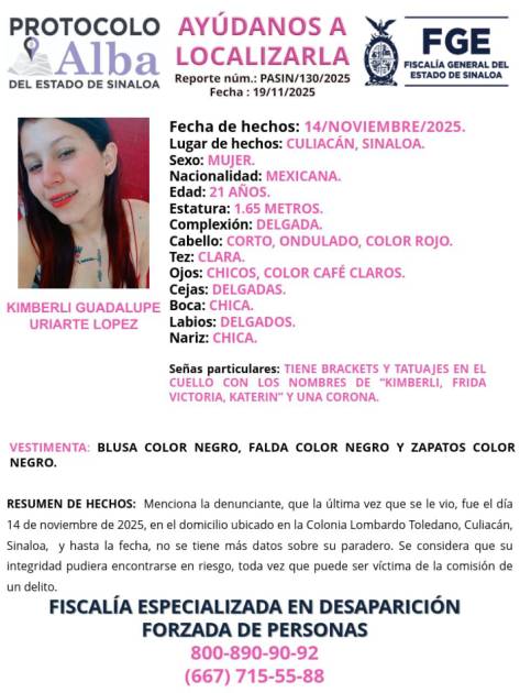 La Fiscalía General del Estado (FGE) de Sinaloa activó el Protocolo Alba para localizar a Kimberli Guadalupe Uriarte López, de 21 años, quien se encuentra desaparecida desde hace varios días en la capital sinaloense.