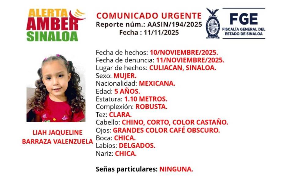 La Fiscalía General del Estado emitió Alerta Amber por la desaparición de Liah Jaqueline Barraza Valenzuela, en Culiacán.