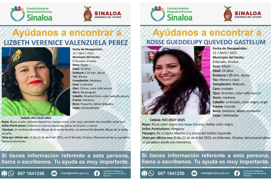 CULIACÁN. _ La Comisión Estatal de Búsqueda de Personas del Estado de Sinaloa emitió una ficha de búsqueda para localizar a Lizbeth Verenice Valenzuela Pérez, y Rosse Gueddelipy Quevedo Gastelum, ambas desaparecidas en el municipio de Eldorado el 22 de abril del año en curso.