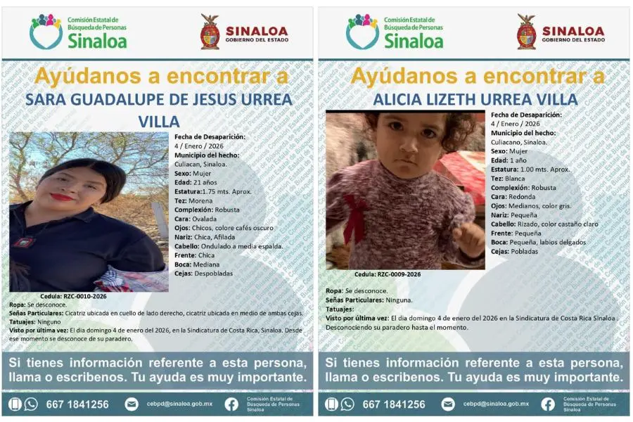 La Comisión Estatal de Búsqueda de Personas en Sinaloa emitió dos fichas de búsqueda tras reportarse la desaparición de Sara Guadalupe de Jesús Urrea Villa, de 21 años, y su hija, la menor Alicia Lizeth Urrea Villa, de apenas un año de edad.