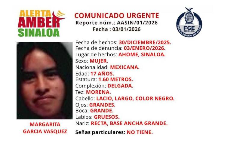 La Fiscalía General del Estado activó una Alerta Amber por la desaparición de Margarita García Vásquez, reportada como extraviada en el municipio de Ahome.