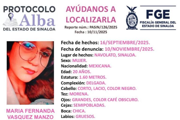 NAVOLATO. _ La Fiscalía General del Estado de Sinaloa (FGE), activó el Protocolo Alba para localizar a María Fernanda Vásquez Manzo, de 20 años de edad, quien fue reportada como desaparecida en el municipio de Navolato, desde hace 57 días.