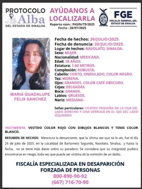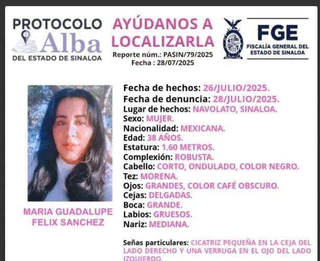 CULIACÁN. _ La Fiscalía General del Estado de Sinaloa activó el Protocolo Alba para localizar a María Guadalupe Félix Sánchez, de 38 años de edad, quien fue vista por última vez el pasado 26 de julio de 2025 en la localidad de Bariometo Segundo, perteneciente al municipio de Navolato.