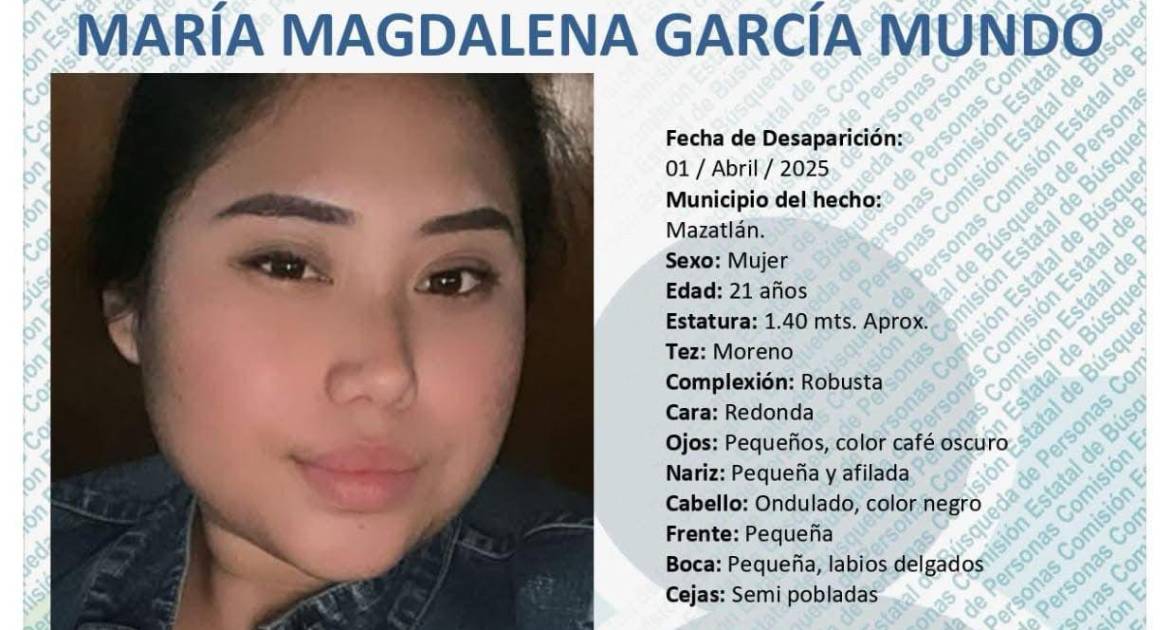 La Comisión Estatal de Búsqueda de Personas de Sinaloa emitió una alerta para localizar a María Magdalena García Mundo, una joven de 21 años desaparecida desde el 1 de abril en Mazatlán.
