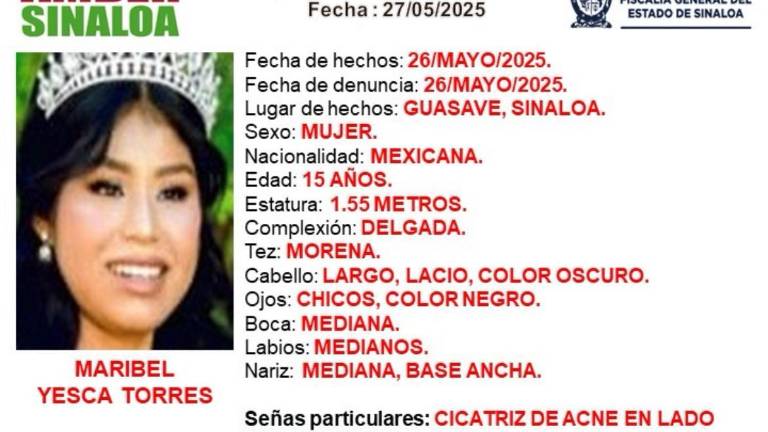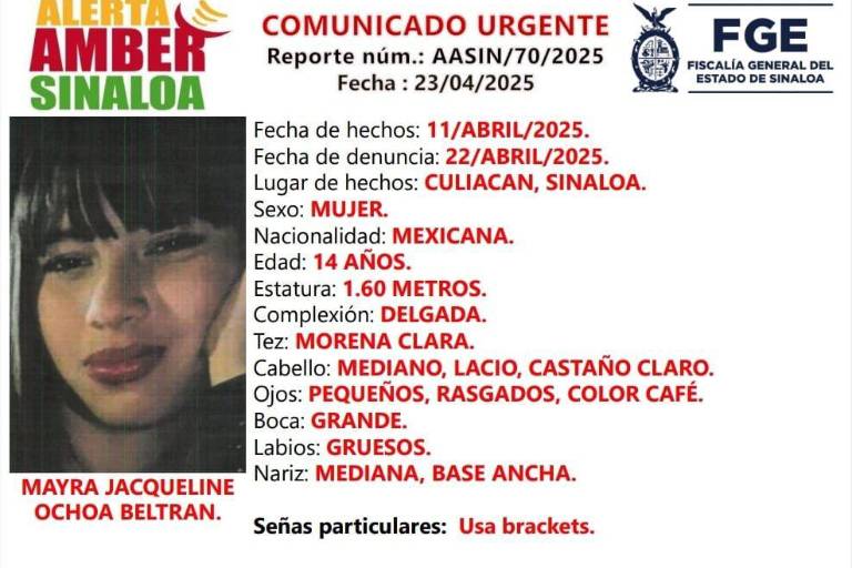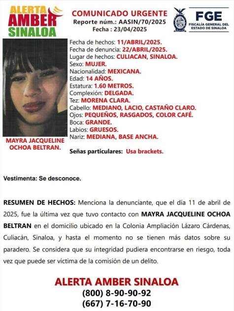 CULIACÁN. _ La Fiscalía General del Estado de Sinaloa (FGE) activó una Alerta Amber para localizar a Mayra Jacqueline ‘N’, de 14 años de edad desaparecida el pasado 11 de abril en Culiacán.