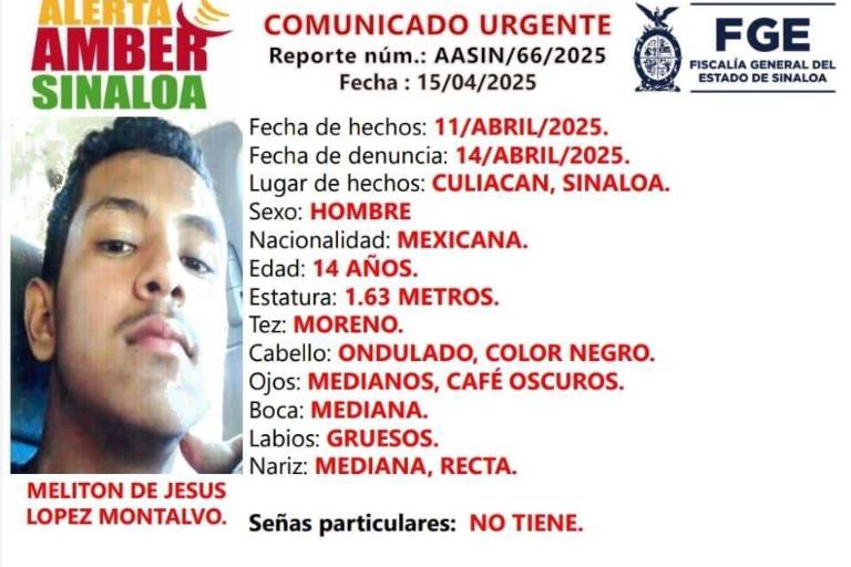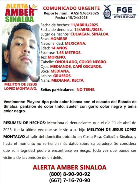CULIACÁN._ La Fiscalía General del Estado de Sinaloa (FGE) activó este martes la Alerta Amber para localizar a Melitón de Jesús “N”, adolescente de 14 años de edad que fue visto por última vez el pasado 11 de abril al salir de su domicilio ubicado en la sindicatura de Costa Rica, Culiacán.