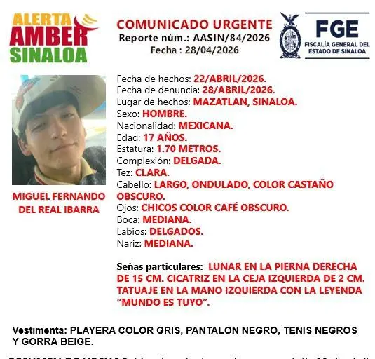 La Fiscalía General del Estado emitió una ficha de búsqueda bajo Alerta Amber por la desaparición de Miguel Fernando Del Real Ibarra, un adolescente de 17 años de edad.