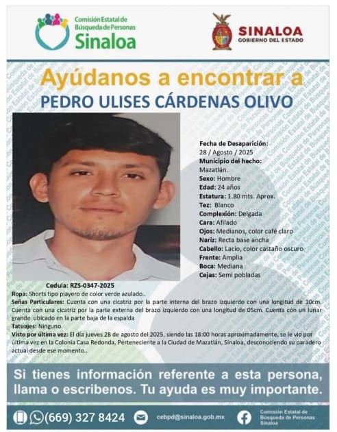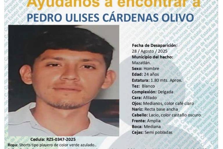 MAZATLÁN. _ La Comisión Estatal de Búsqueda de Personas reportó la desaparición de Pedro Ulises Cárdenas Olivo, un joven de 24 años, visto por última vez el pasado 28 de agosto de 2025, alrededor de las 18:00 horas, en la colonia Casa Redonda de este municipio.