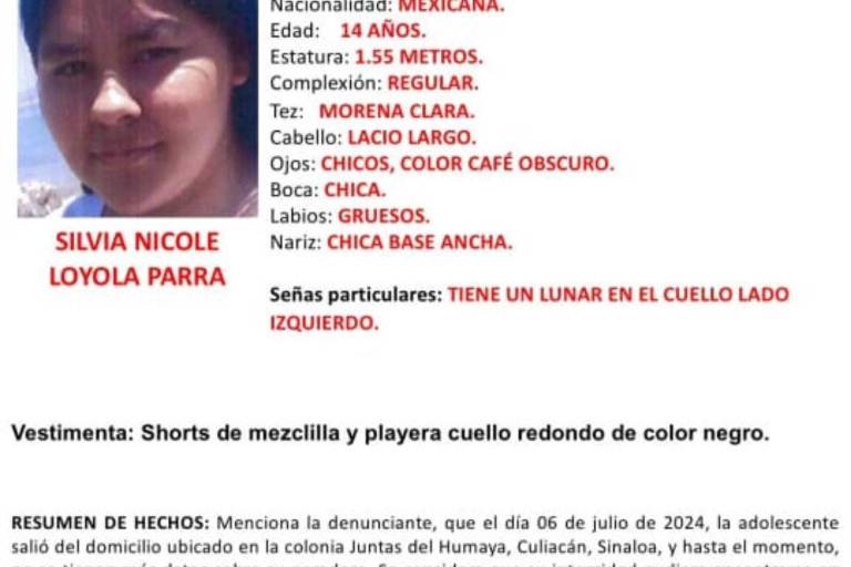 CULIACÁN._ Silvia Nicole Loyola Parra, de 14 años, fue vista por última vez el sábado 6 de julio cuando salió de su domicilio ubicado en Juntas del Humaya en Culiacán.