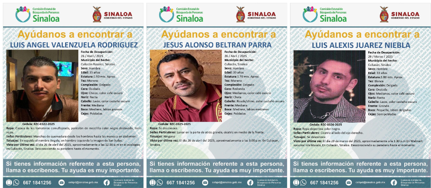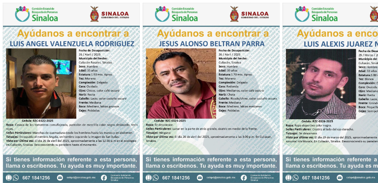 CULIACÁN. _ La Comisión Estatal de Búsqueda de Personas del Estado de Sinaloa ha emitido fichas de búsqueda para localizar a tres hombres reportados como desaparecidos en diferentes hechos registrados en la capital sinaloense.