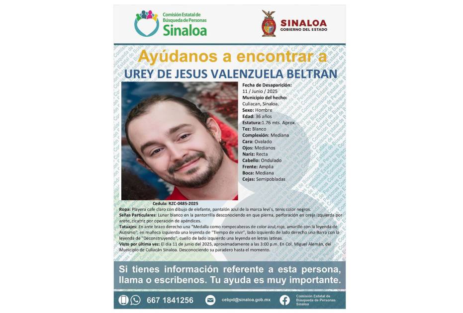 En Culiacán buscan a Urey de Jesús Valenzuela Beltrán, de 36 años de edad, quien fue visto por última vez en la colonia Miguel Alemán.