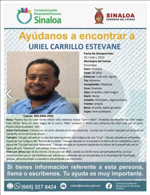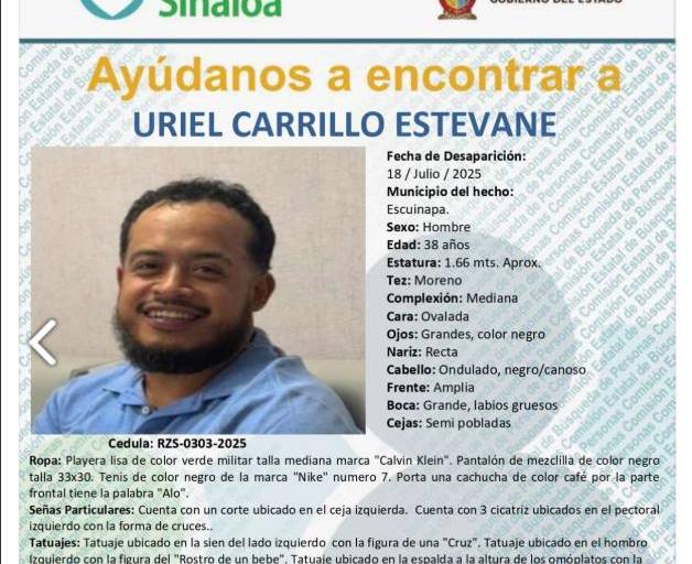 CULIACÁN. _ La Comisión Estatal de Búsqueda de Personas del Estado de Sinaloa ha emitido una ficha oficial para solicitar la colaboración ciudadana en la localización de Uriel Carrillo Estevane, de 38 años de edad, reportado como desaparecido desde el pasado 18 de julio de 2025.