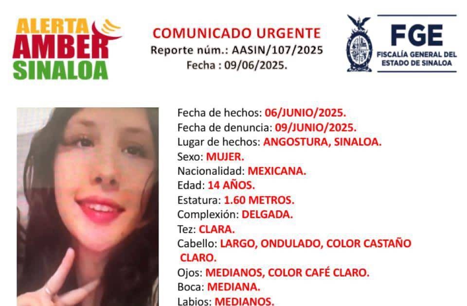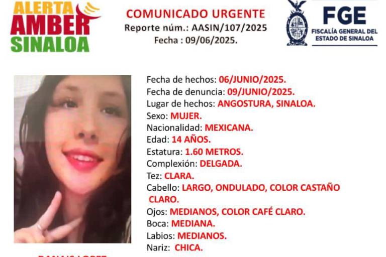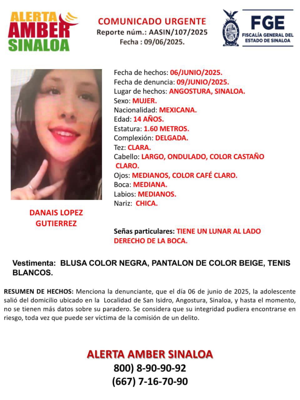ANGOSTURA . _ La Fiscalía General del Estado de Sinaloa activó la Alerta Amber para localizar a Danais “N”, una adolescente de 14 años de edad, reportada como desaparecida desde el pasado 6 de junio en la localidad de San Isidro, municipio de Angostura.