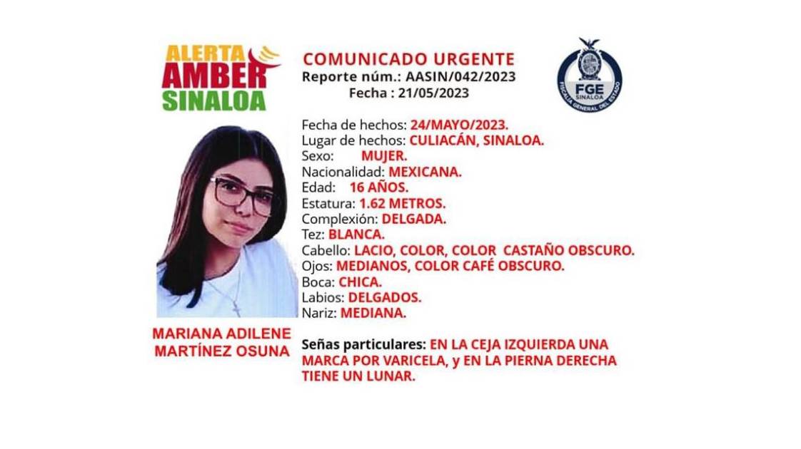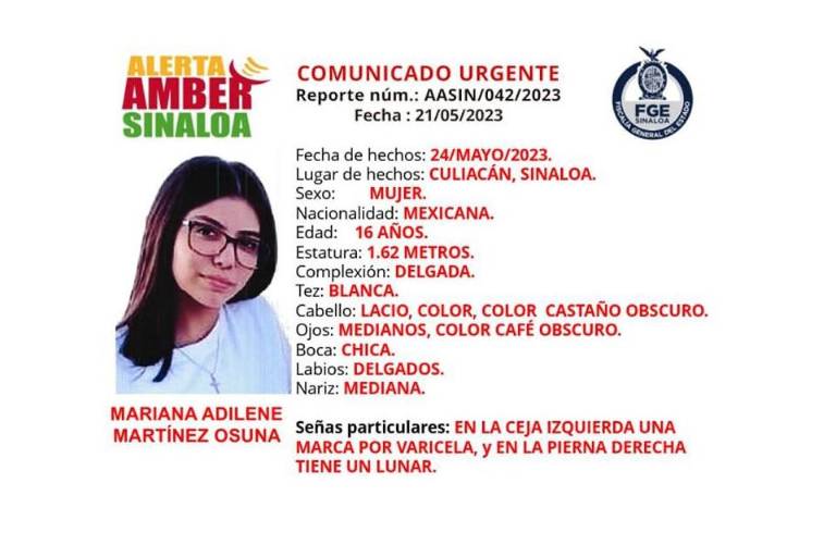 Según la ficha de la Alerta Ámber emitida por la Fiscalía de Sinaloa, y que también ha compartido la Secretaría de Seguridad Pública estatal, desde que la joven salió de su domicilio, en el Infonavit Barrancos, ya no se supo más de ella.