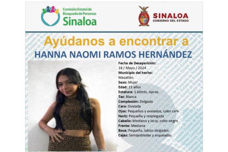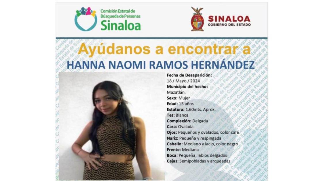 La familia de Hanna Naomi Ramos Hernández y las autoridades emitieron una ficha de búsqueda de la menor, reportada como desaparecida el 18 de mayo, en Mazatlán.