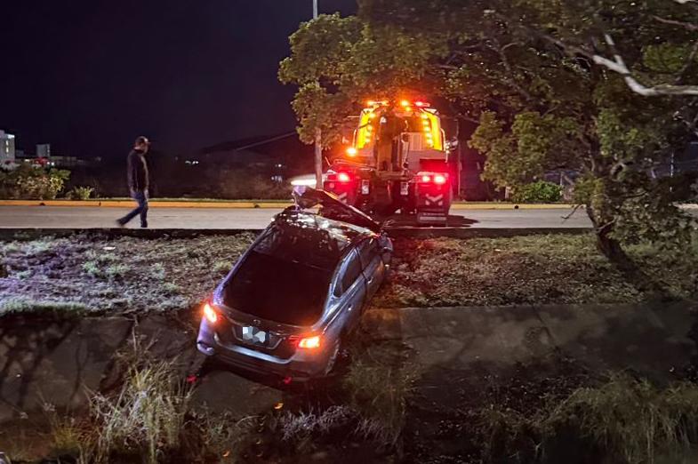 Al parecer, el conductor del Nissan Sentra perdió el control al tomar la curva de la avenida con velocidad inmoderada; su vehículo terminó brincando la guarnición y cayó al canal pluvial donde quedó volcado.