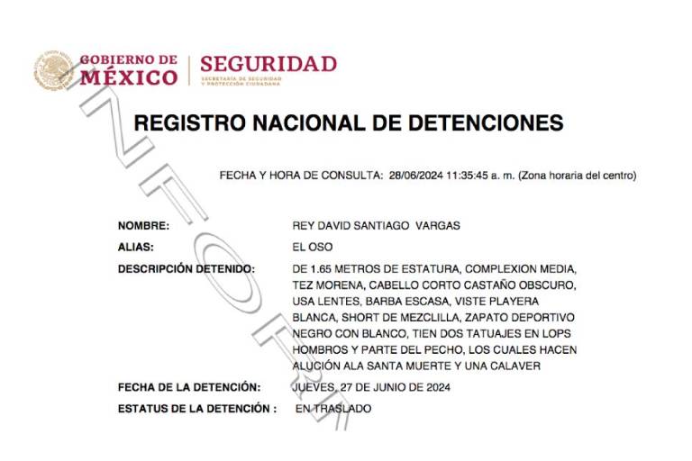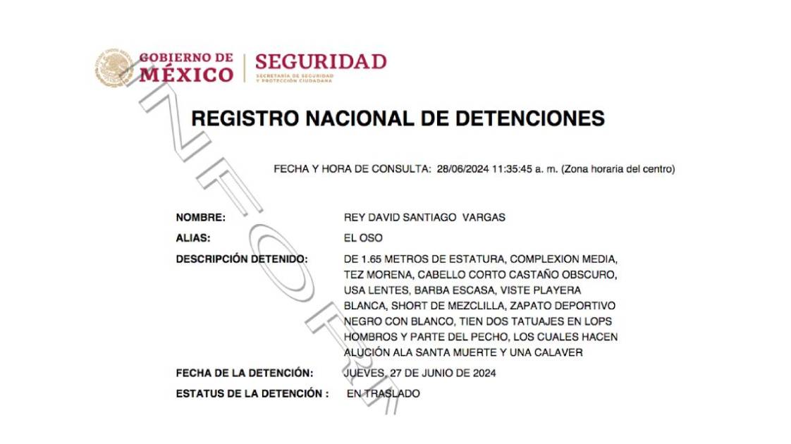 El Registro Nacional de Detenciones confirmó la captura de Rey David Santiago Vargas, “El Oso”, durante la madrugada del pasado jueves en Culiacán.