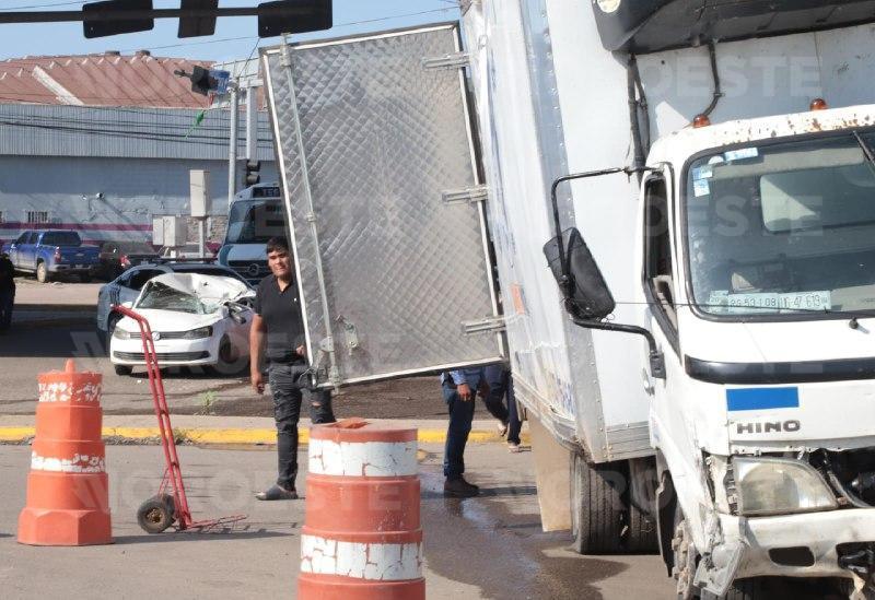 La unidad de carga circulaba sobre la Internacional y al intentar incorporarse al Libramiento Colosio, la carga se desplazó, lo que provocó que el camión volcara hacia su costado derecho, aplastando parcialmente un Volkswagen Gol.