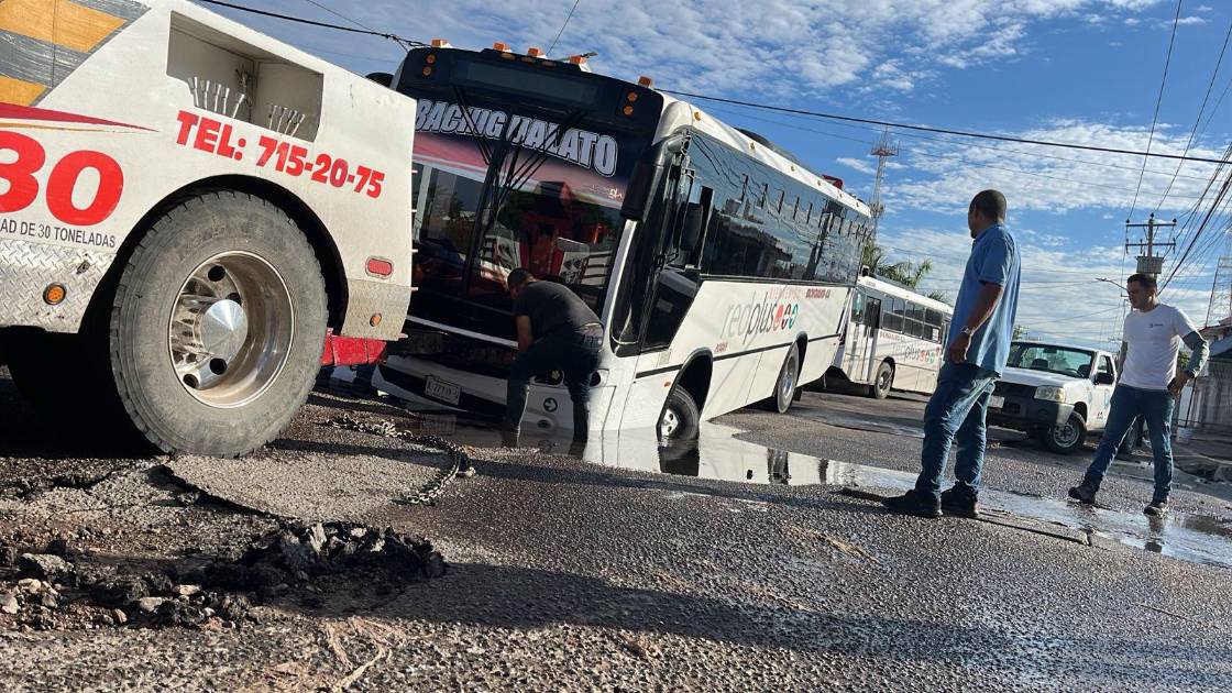 CULIACÁN. _ Un camión urbano cayó en un socavón la mañana de este viernes en la colonia Infonavit Humaya, en Culiacán, luego de que el conductor intentara cruzar un charco de agua en el cruce del bulevar República de Brasil y la calle Internacional Vieja.