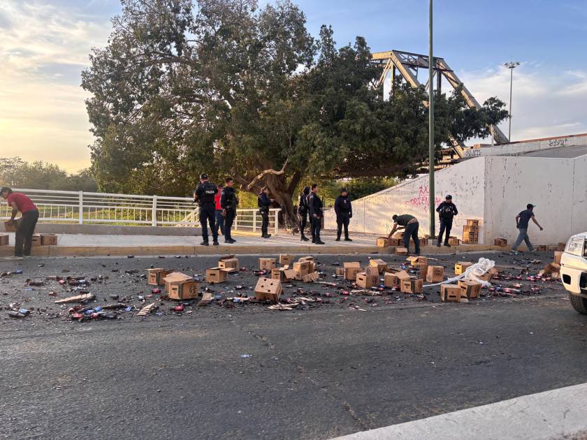 Camionero pierde el control y deja varias cajas de cervezas regadas debajo del Puente Negro de Culiacán