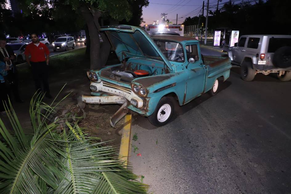 MAZATLÁN._ El conductor de una camioneta de modelo clásico perdió el control e invadió el camellón central de la avenida Leonismo Internacional, donde chocó contra una palmera, la cual fue arrancada de raíz por el impacto.