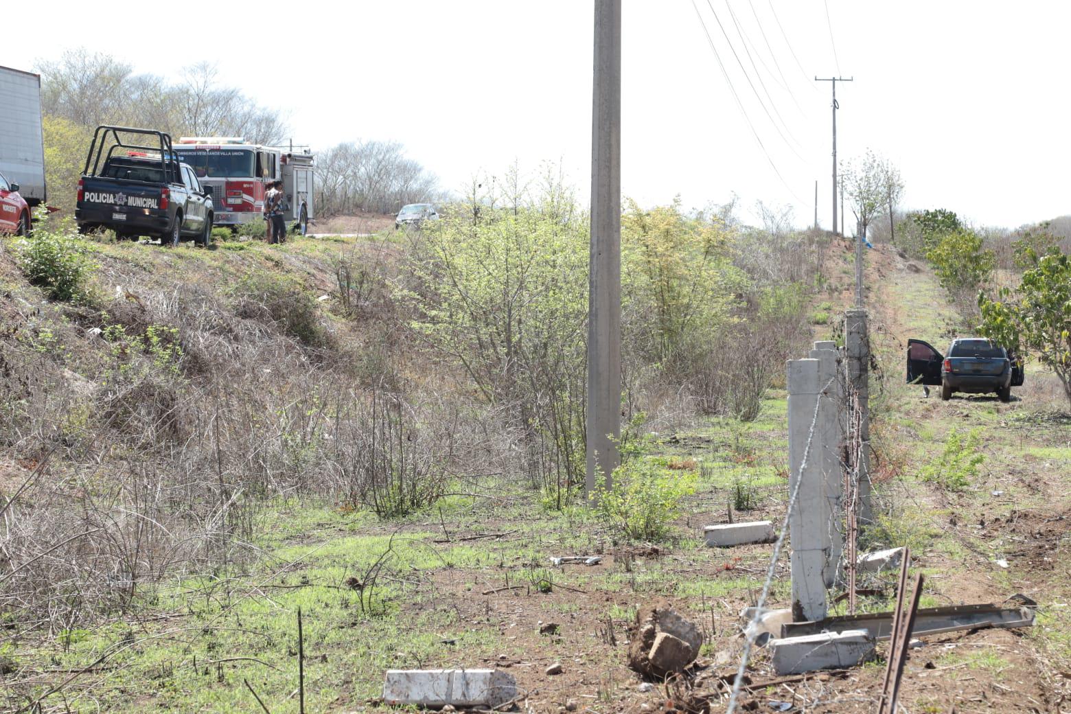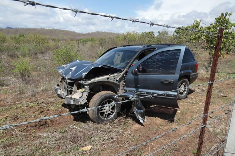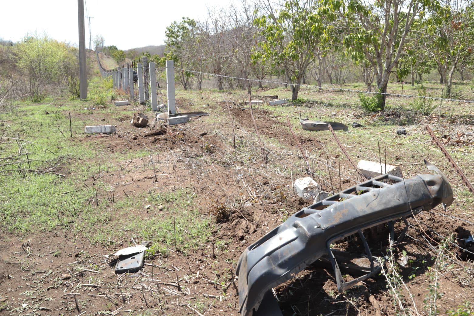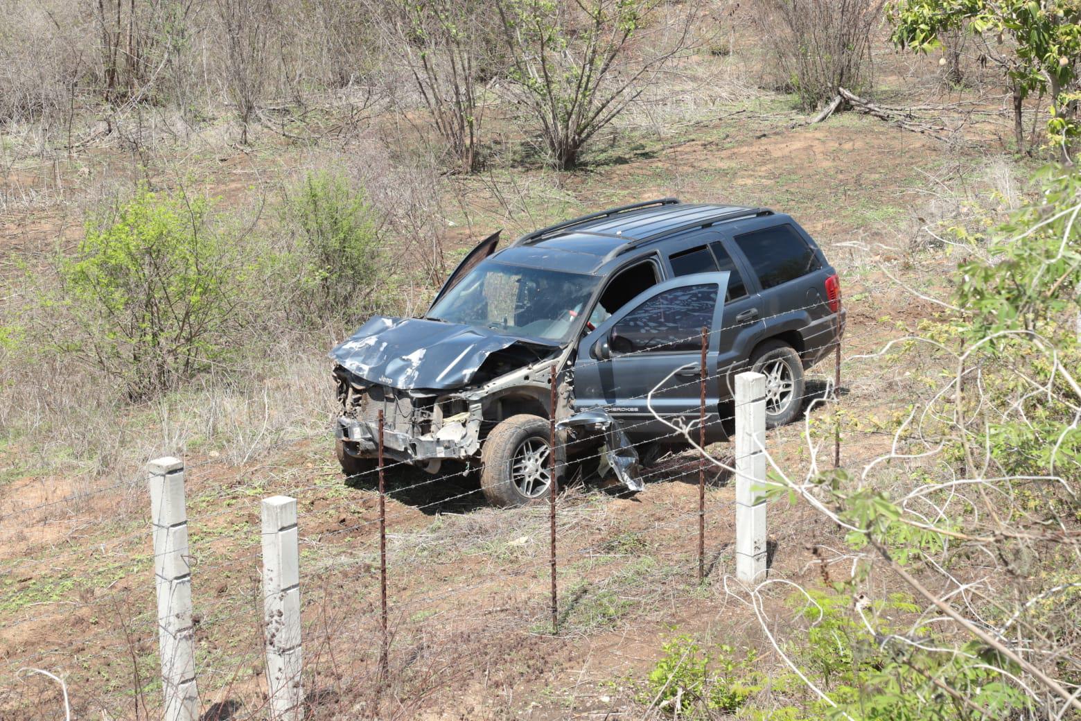 Por causas aún desconocidas, el conductor perdió el control del volante y la camioneta Jeep Grand Cherokee se salió hacia un lado de la carretera y chocó contra dos puntales de concreto del cerco de púas de una huerta de mangos.