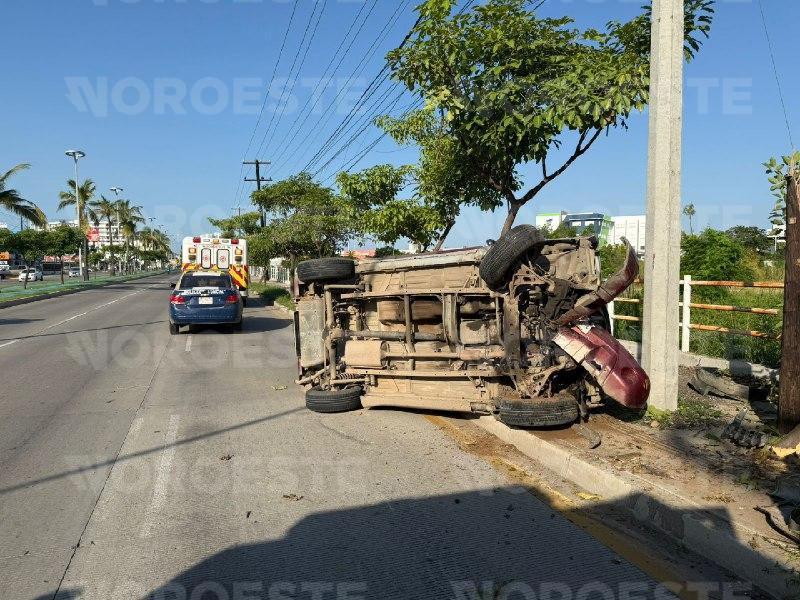 Camioneta vuelca tras chocar contra árbol y poste en la avenida Rafael Buelna, Mazatlán