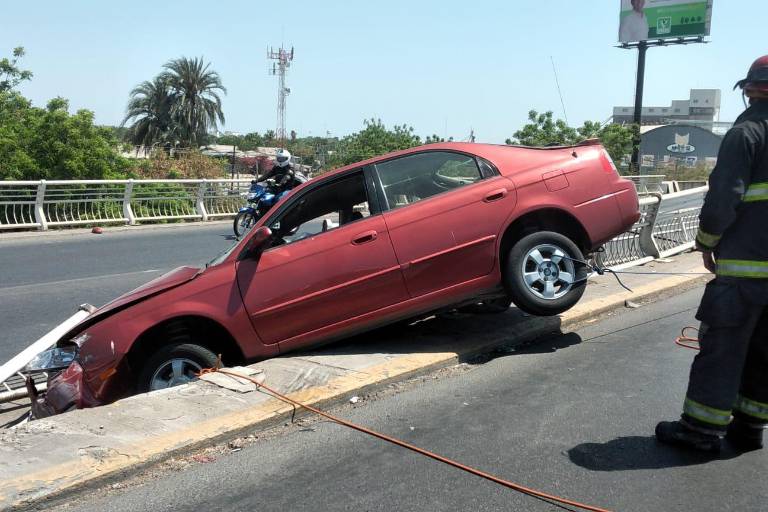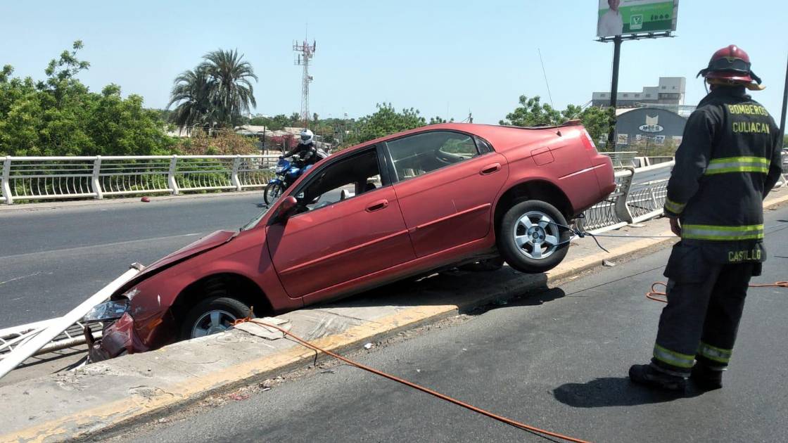 CULIACÁN._ Dos jóvenes que viajaban en un vehículo Kia lograron ponerse a salvo después de que el auto quedara colgando en el puente de la Colonia El palmito.