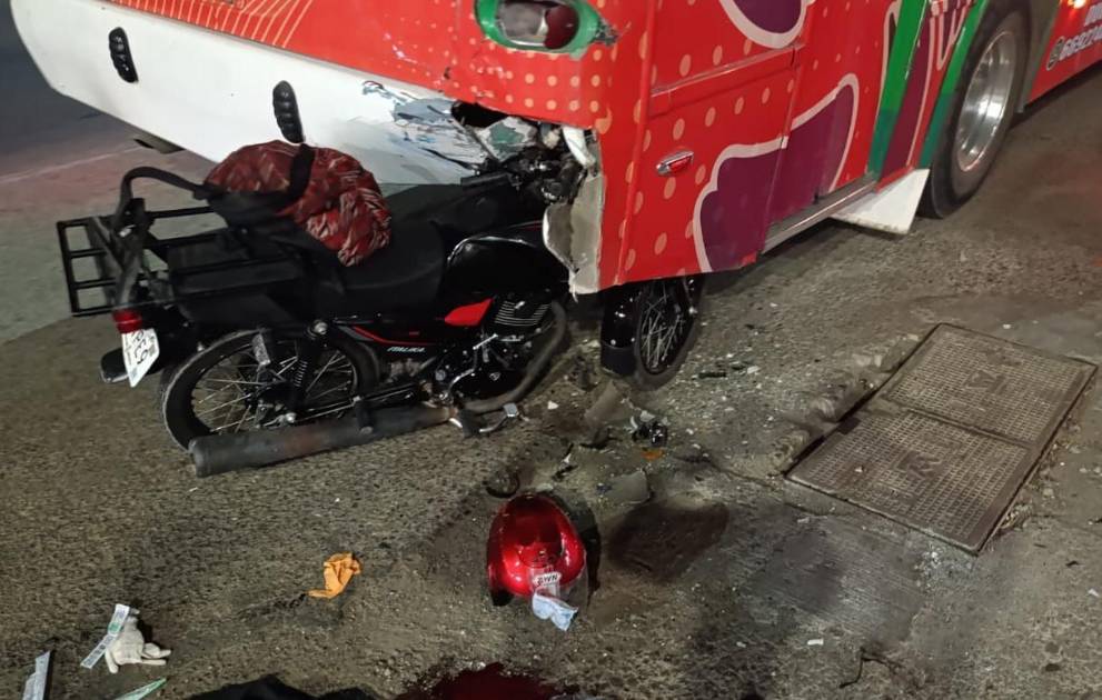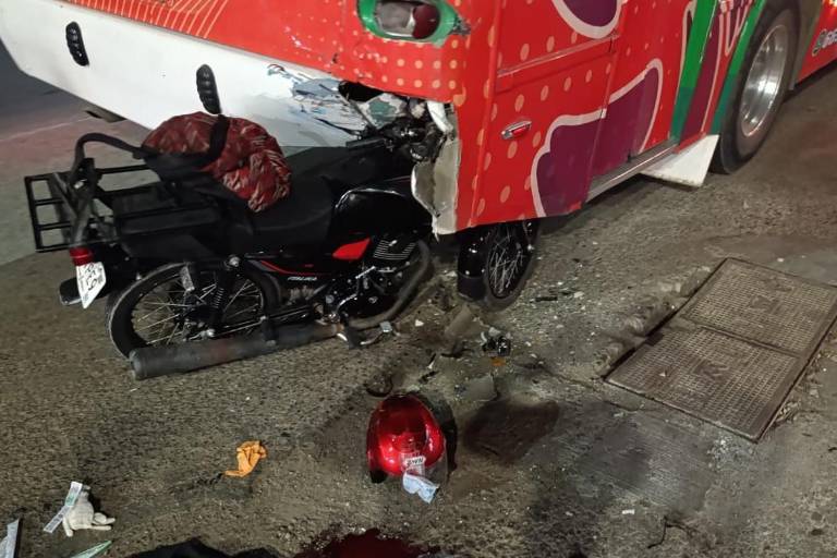 En el impacto, la moto se incrustó en la defensa trasera del camión y el conductor se estampó contra la carrocería del urbano. A pesar de portar casco, al parecer sufrió probable traumatismo craneoencefálico severo.