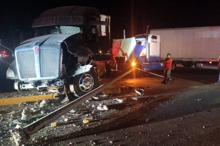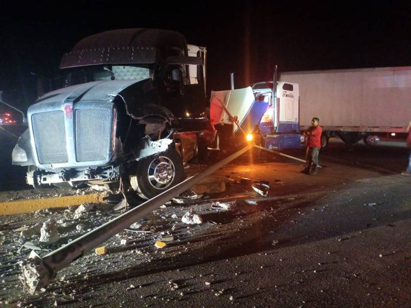 Los colosos coincidieron en el entronque, pero a uno de los tractocamiones le fallaron los frenos y colisionó contra la cabina del otro tráiler, además derribó una luminaria del camellón central.