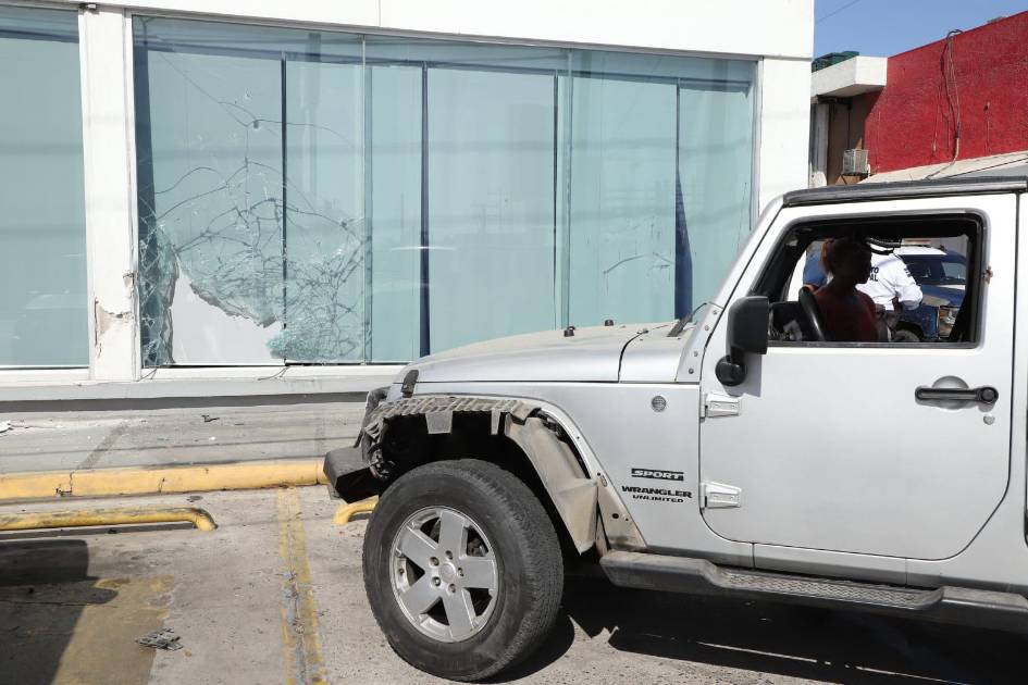 Tras la choque, el Jeep salió proyectado sin control contra el estacionamiento de un banco, donde derribó una caseta telefónica y terminó su carrera al estrellarse contra un cristal y una columna del edificio.