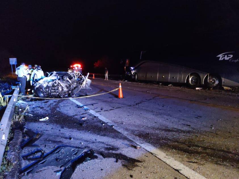 Las unidades involucradas en el fatal accidente son un automóvil Volkswagen Jetta, en el cual viajaban dos hombres, y un autotransporte de la línea TAP.