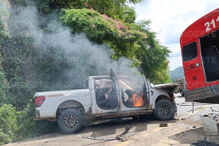 Tras el impacto, la camioneta se incendió y quedó con el frente destrozado, mientras que el camión de pasajeros, que cubría la ruta Mazatlán-Concordia, resultó con el frente también destruido.