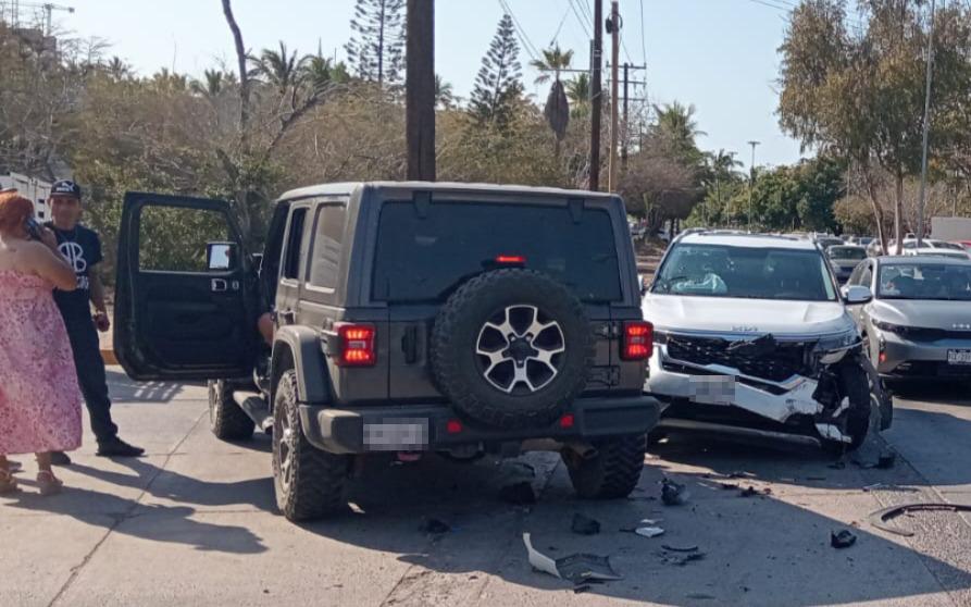 Los vehículos involucrados fueron una camioneta Kia Seltos, que circulaba de norte a sur sobre la Camarón Sábalo y chocó por alcance contra un Jeep Wrangler, que recién se había incorporado a la avenida en el retorno.