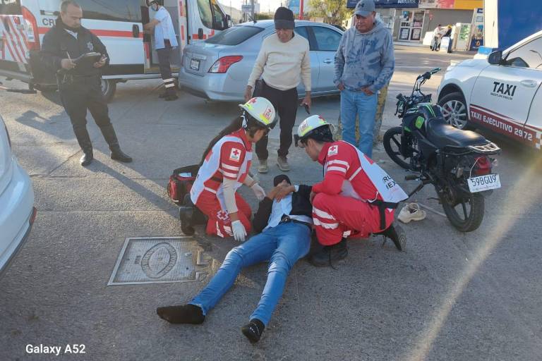 MAZATLÁN._ Un motociclista resultó con probable fractura en una pierna tras chocar contra un taxi rojo en una glorieta del Parque Lineal.