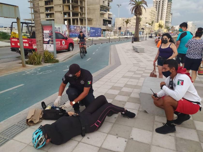 Mazatlán.- Una ciclista que circulaba por la ciclovía paralela al Malecón, sufrió una probable fractura luego de realizar una maniobra para evitar atropellar a unos turistas que cruzaron sin cuidado la ciclovía.