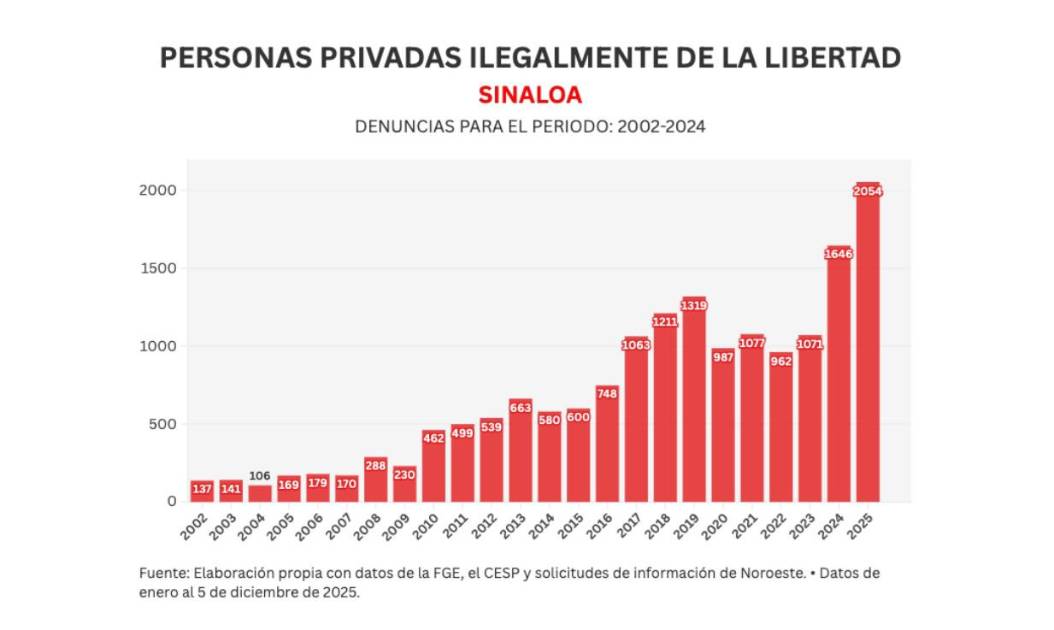 Del 1 de enero al 5 de diciembre de 2025, Sinaloa registra 2 mil 054 denuncias por privaciones ilegales de la libertad, lo que lo convierte en el peor año de la historia en este delito.